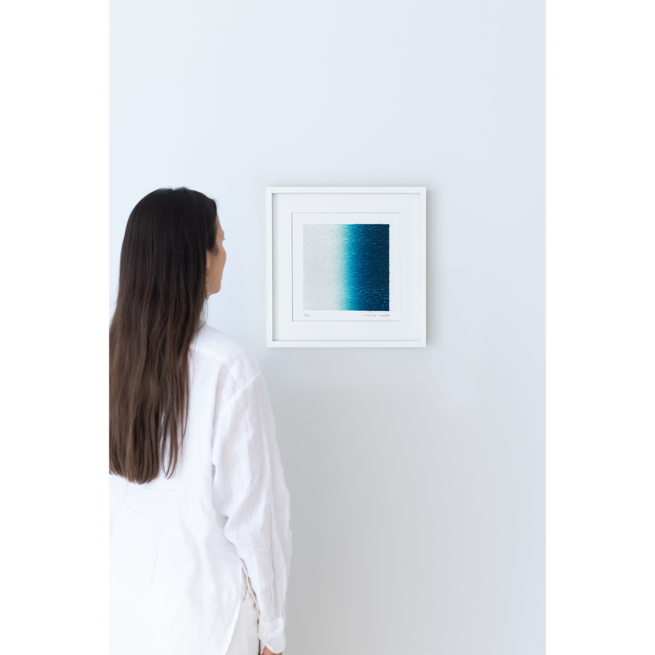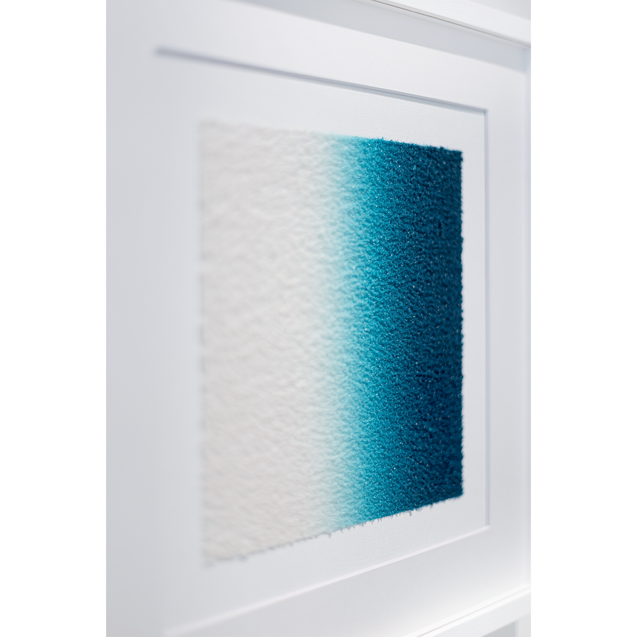 Cada exemplar foi feito manualmente com areia de quartzo pigmentada sobre tela, uma materialidade que preserva a origem e a impermanência que definem o diálogo de Marcos Amato com a natureza.